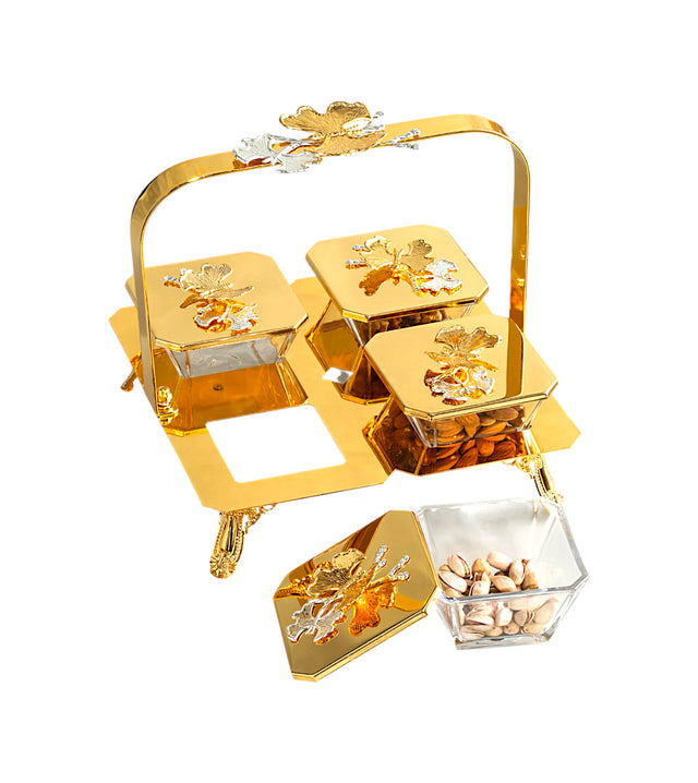 fancy glass bowl & lid 4pc with golden stand china 29020-4g